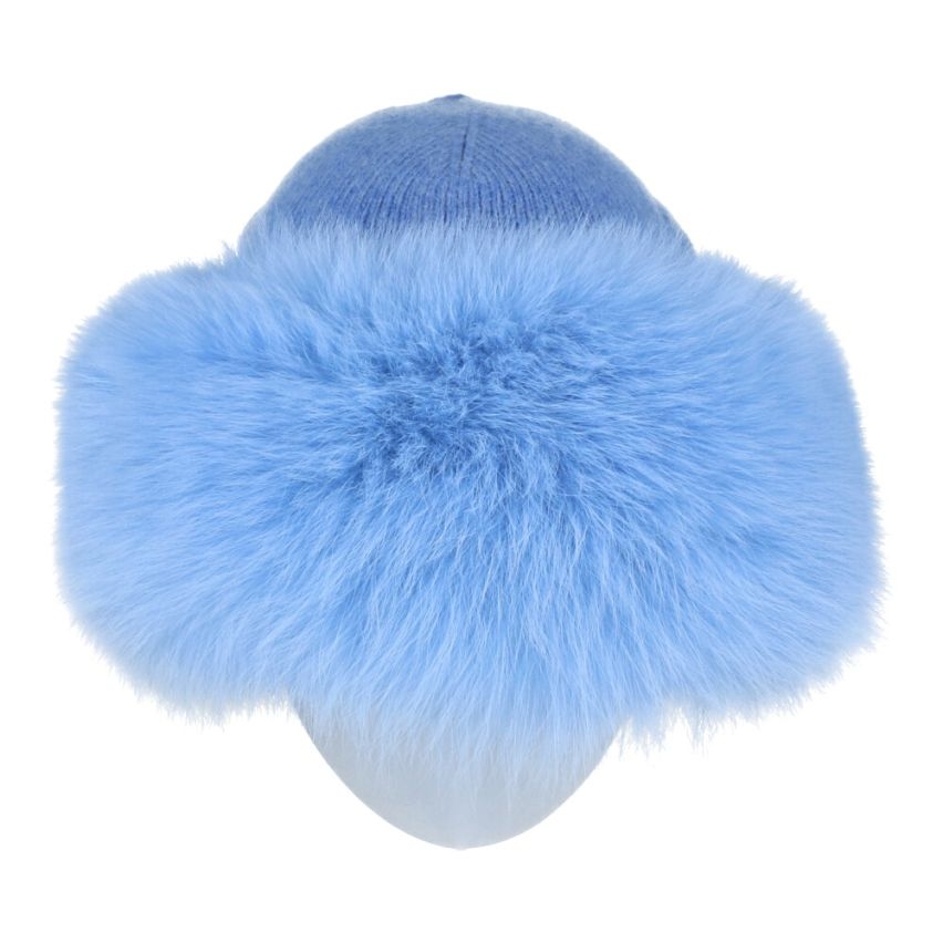 Cappello in lana misto cashmere azzurro con bordo in pelliccia di volpe.