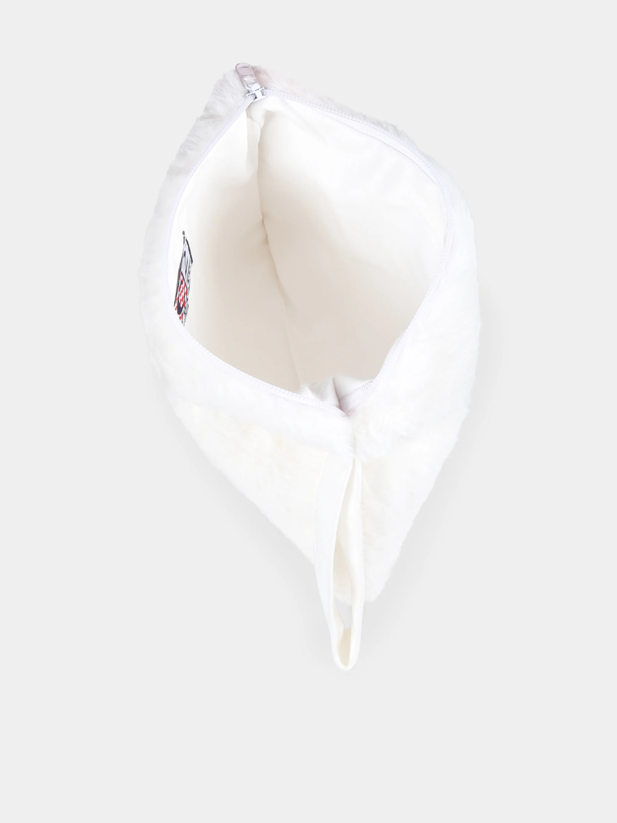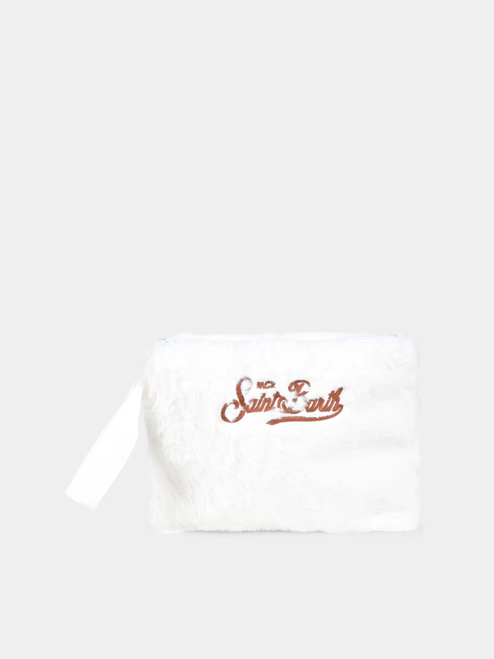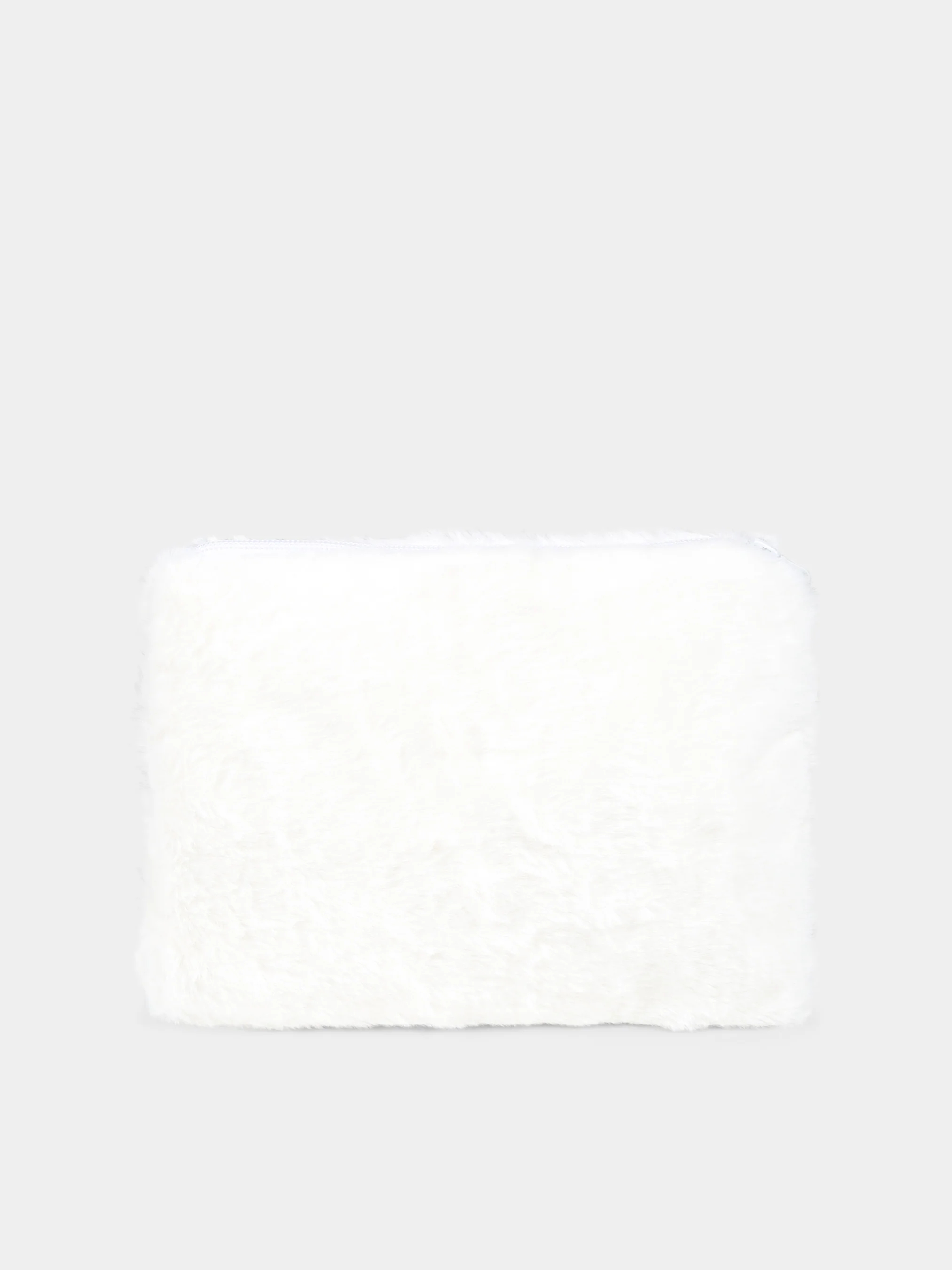 Pochette avorio in ecopelliccia, con manico laterale e chiusura superiore con zip. È decorata con logo ricamato sulla parte anteriore. Dimensioni (L x A): 26cm x20cm