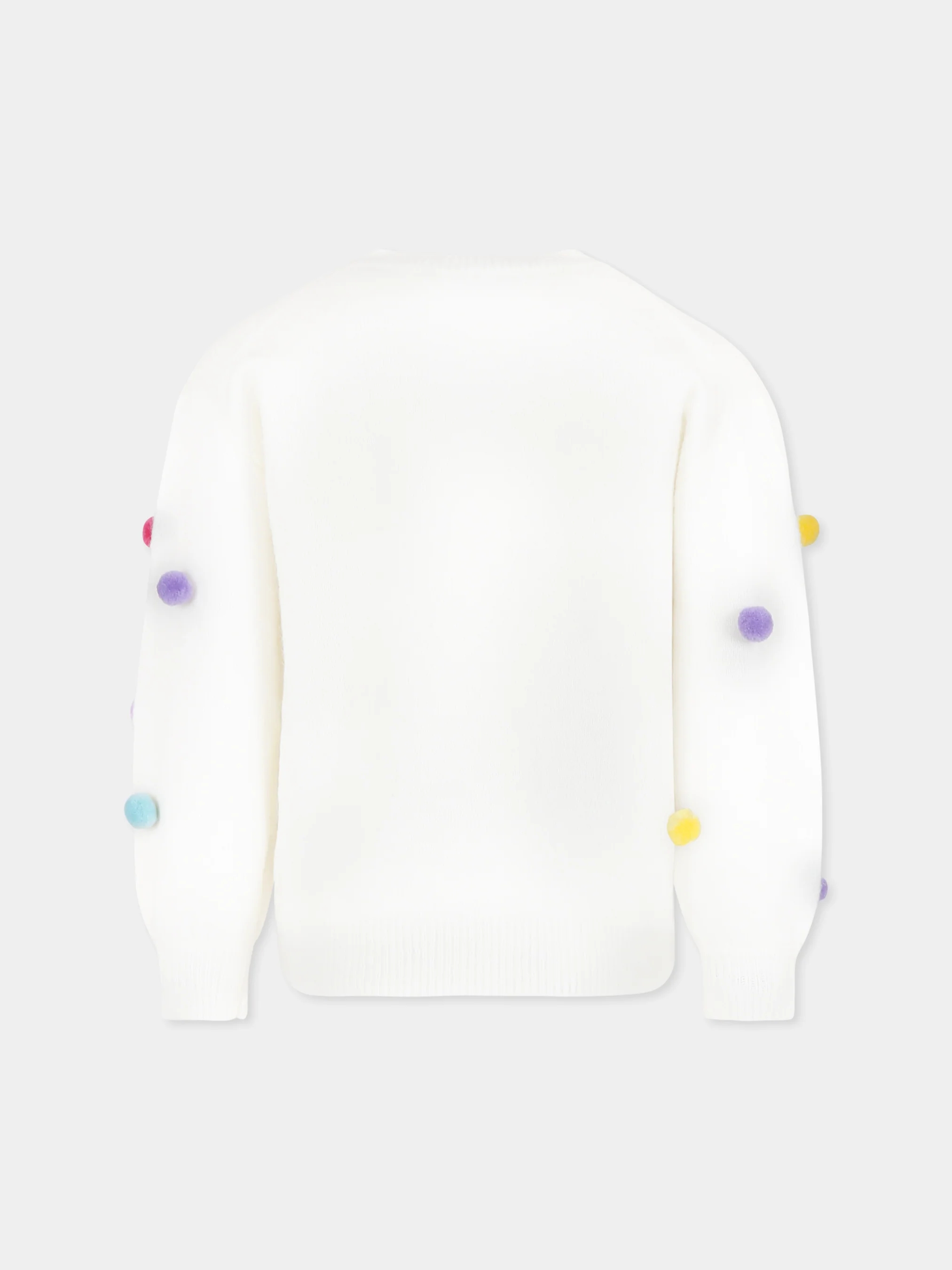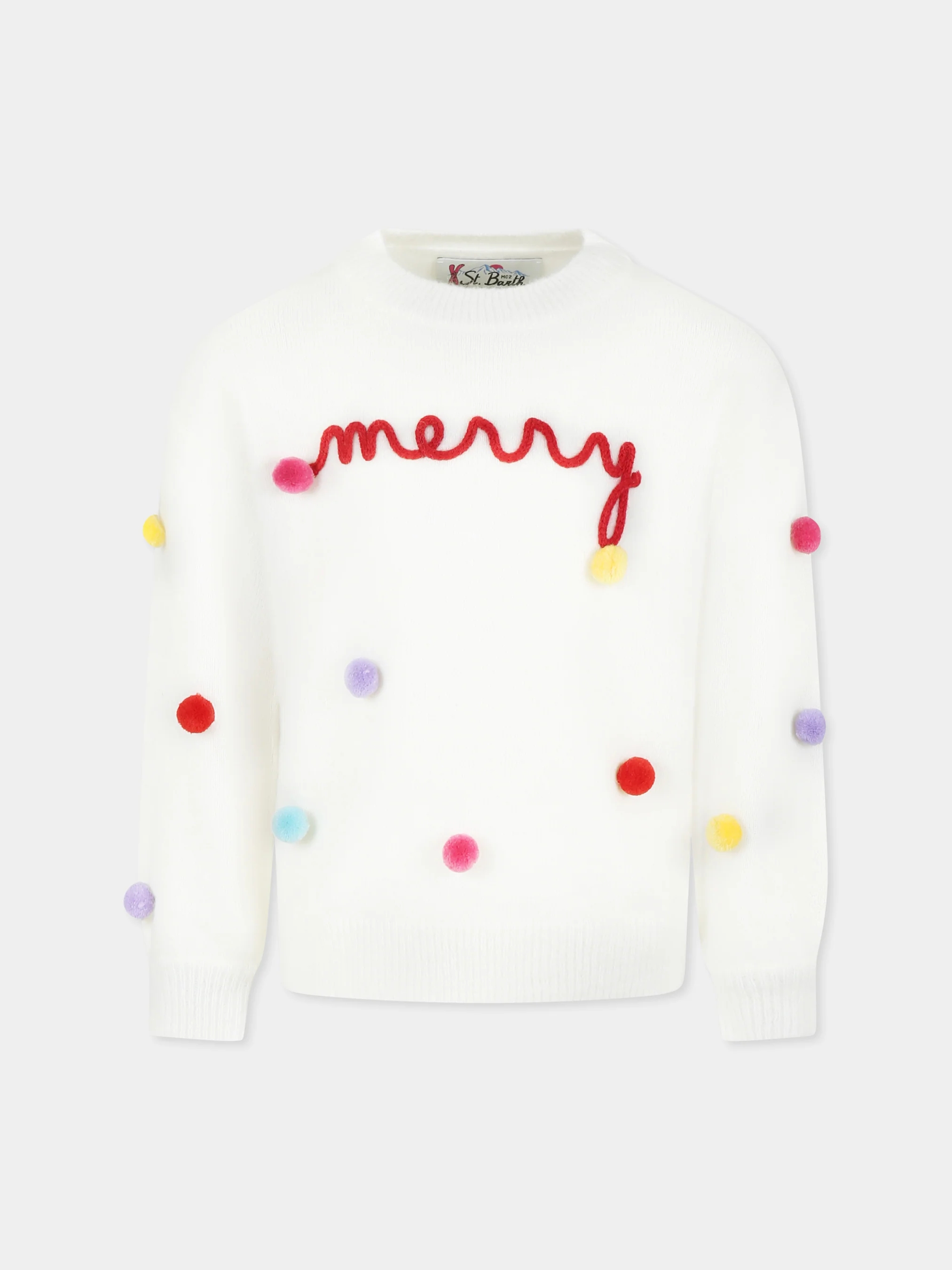 È decorato con scritta Merry ricamata sulla parte anteriore, pom pon multicolor applicati sulle maniche e sulla parte anterio e logo ricamato sulla manica.