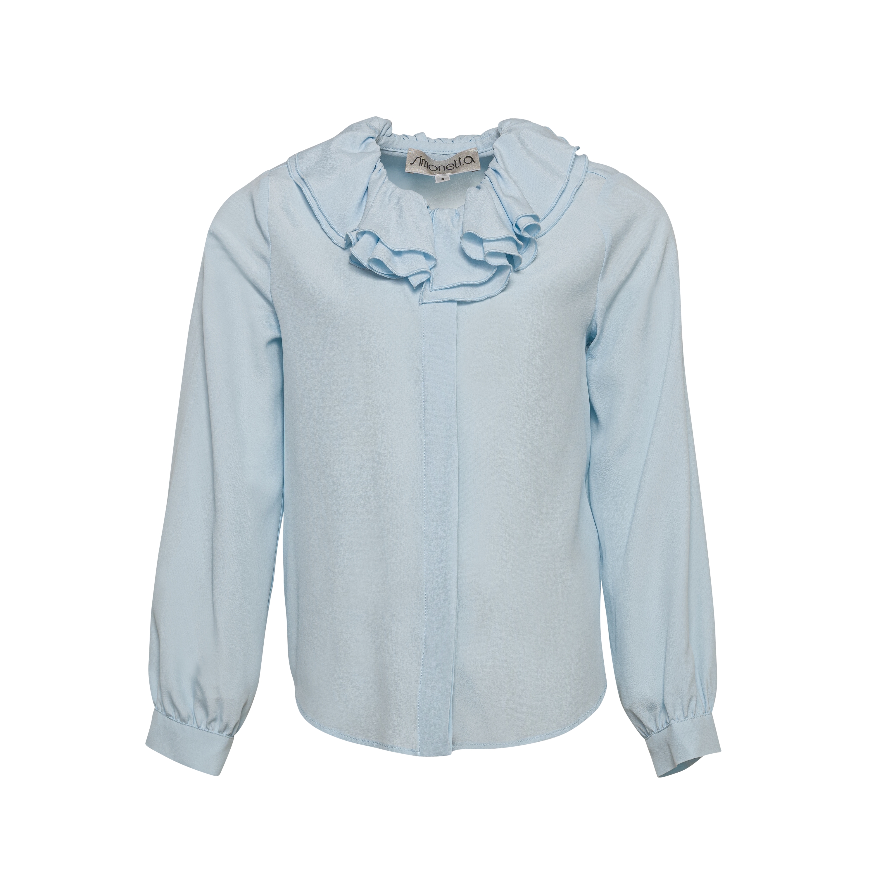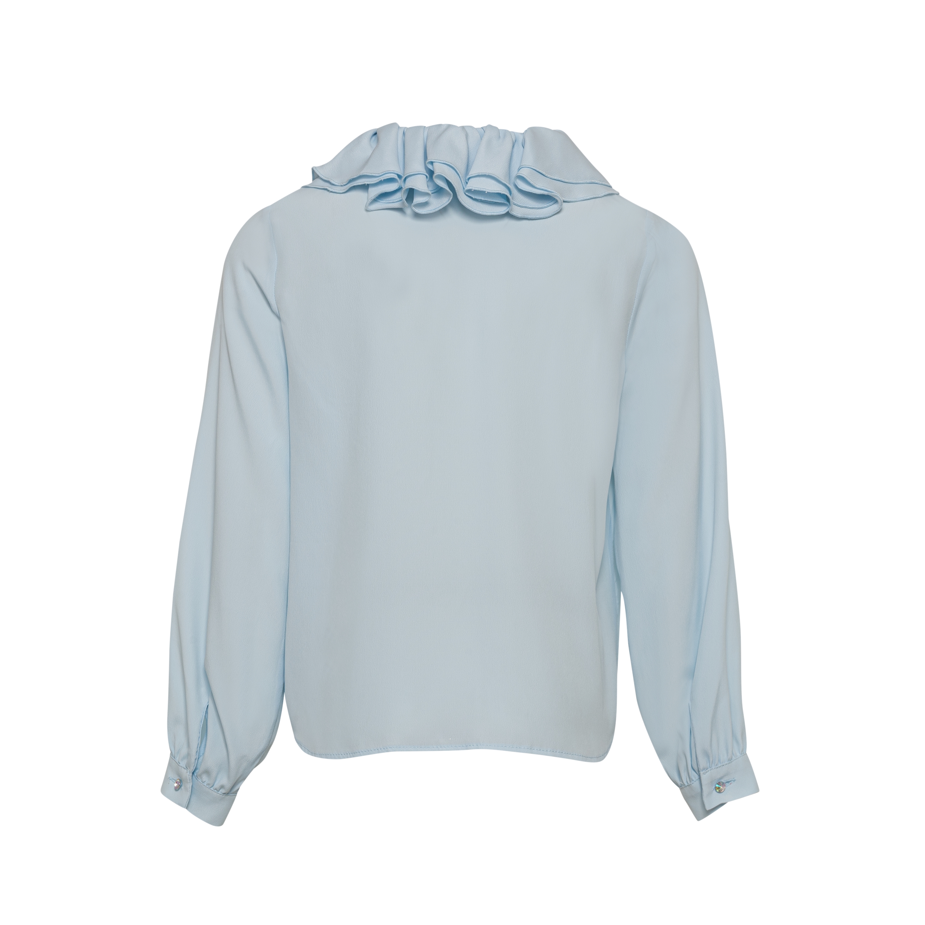 Azzurro cielo, dettaglio plissettato, colletto con increspature, chiusura frontale nascosta, maniche lunghe, polsini con bottoni a pressione e orlo dritto.