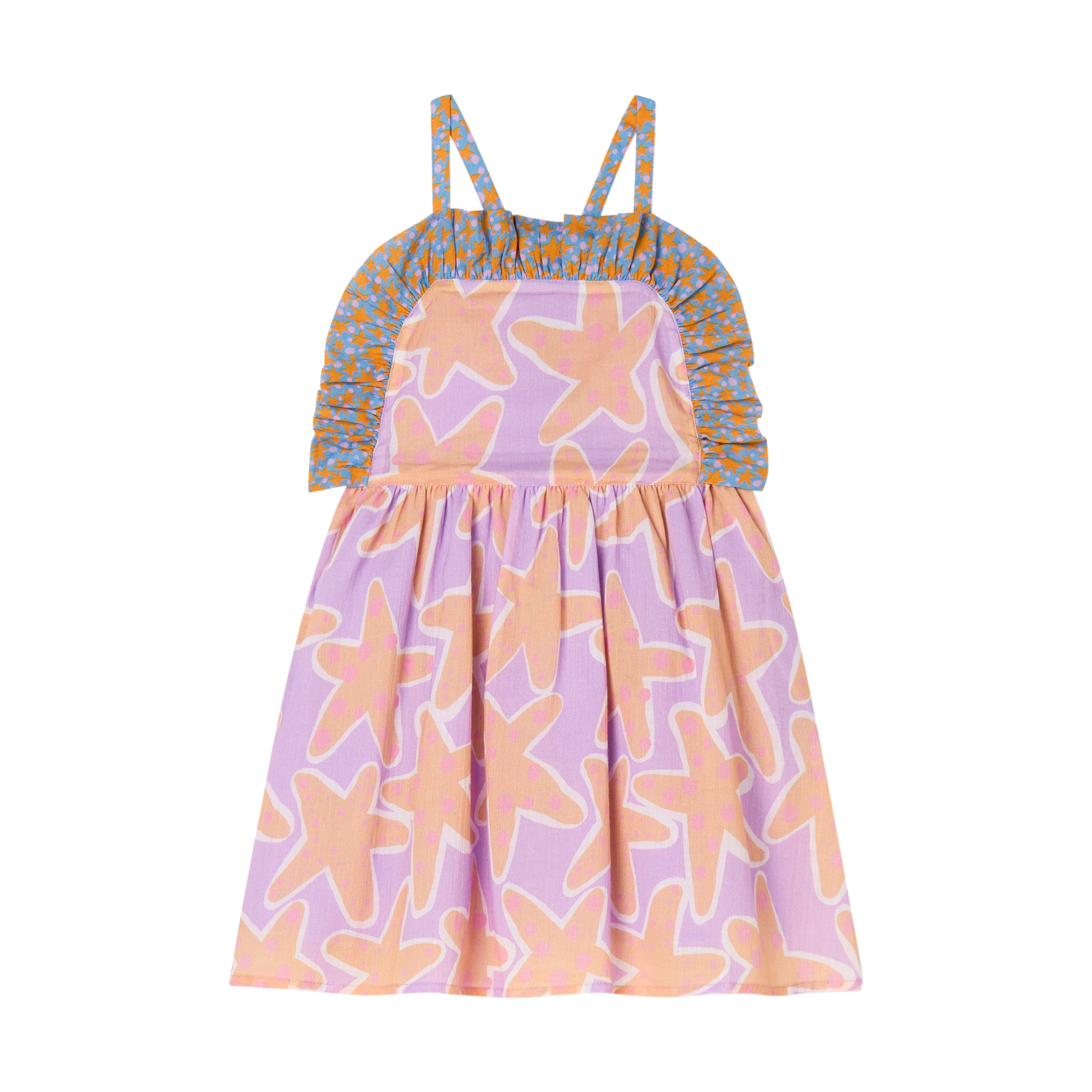 Abito a fantasia stelle , color lilla , con brettelle e Ruches