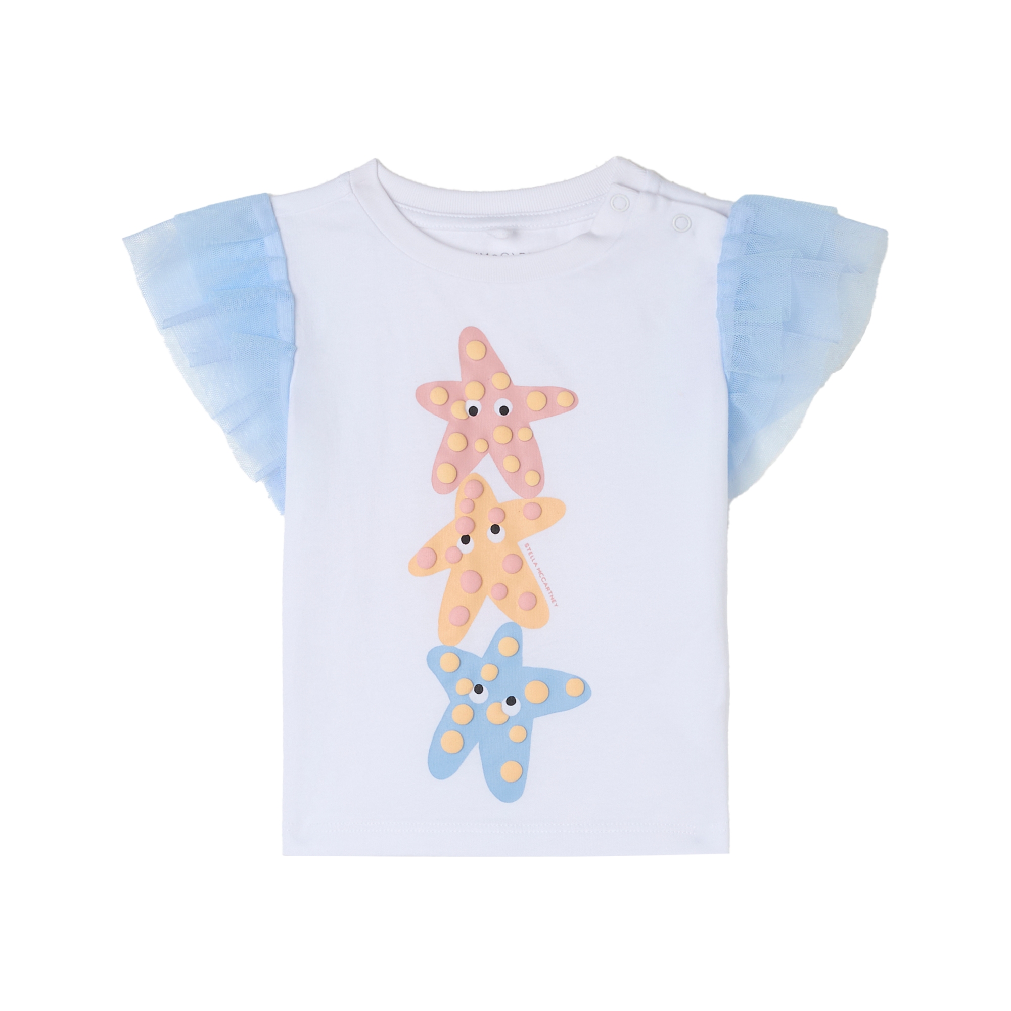 T-shirt con maniche ad aletta in tulle e chiusura sulla spalla con bottoni a pressione