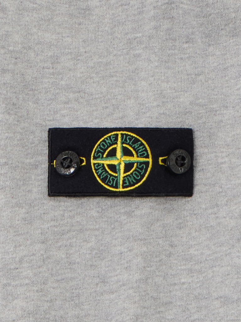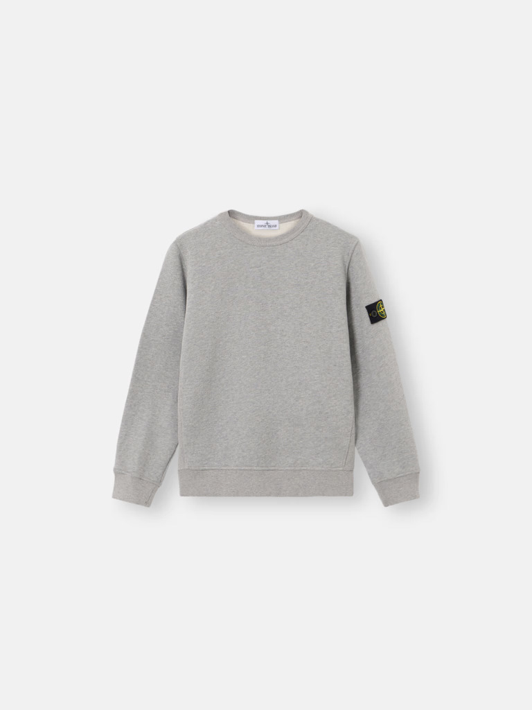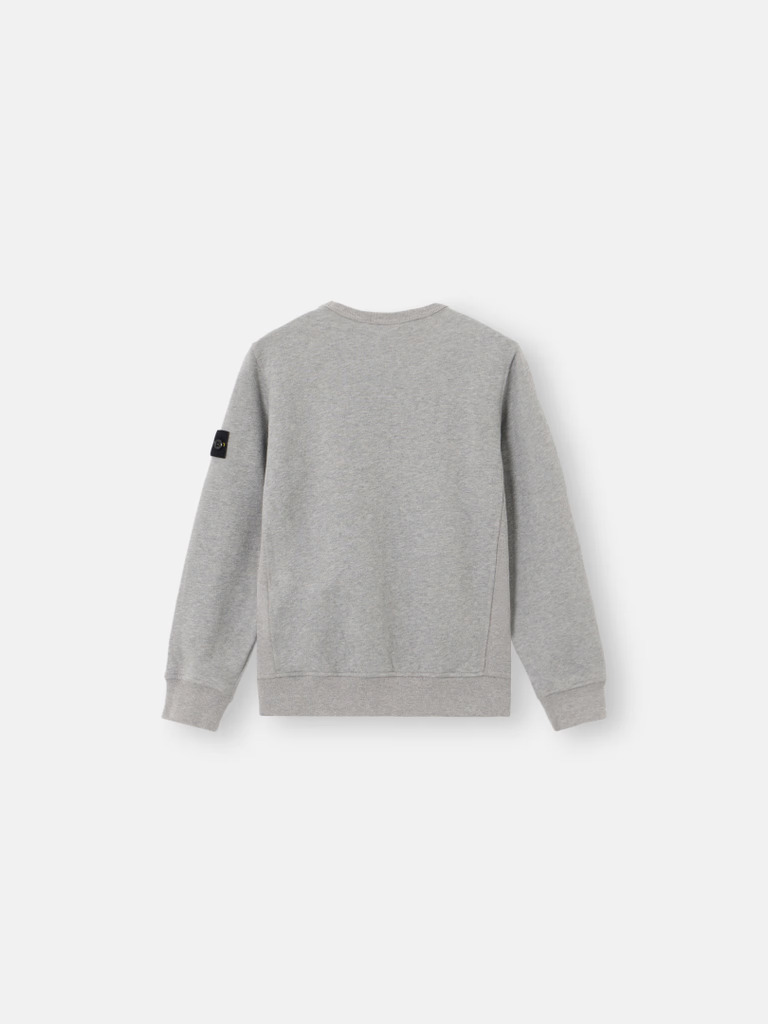 Felpa girocollo in cotone biologico garzato mélange con scollo, fasce laterali, polsini e fascia a fondo capo a costine.