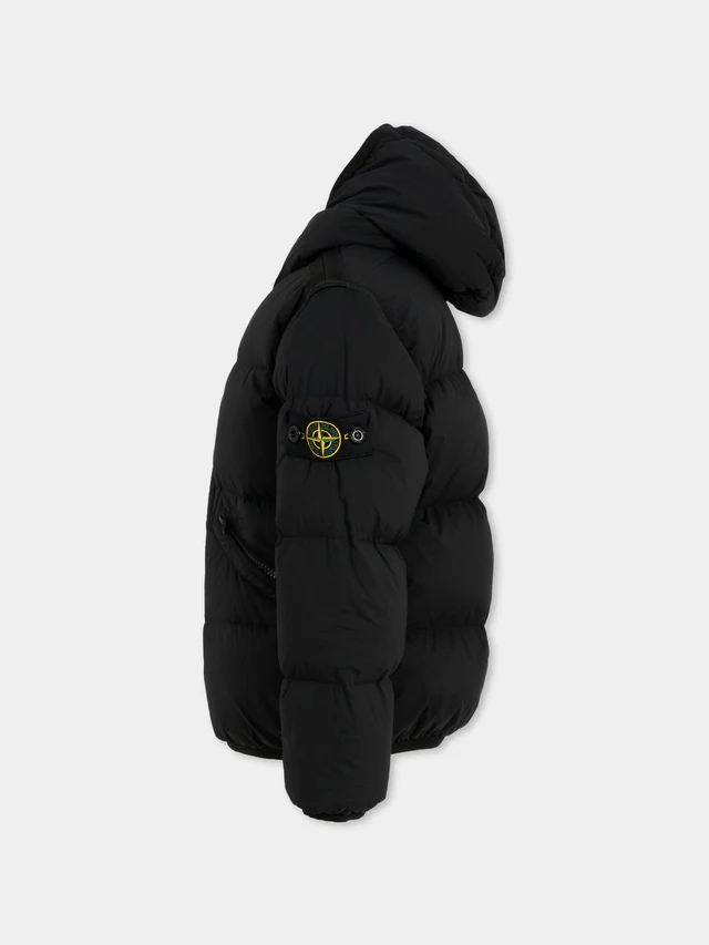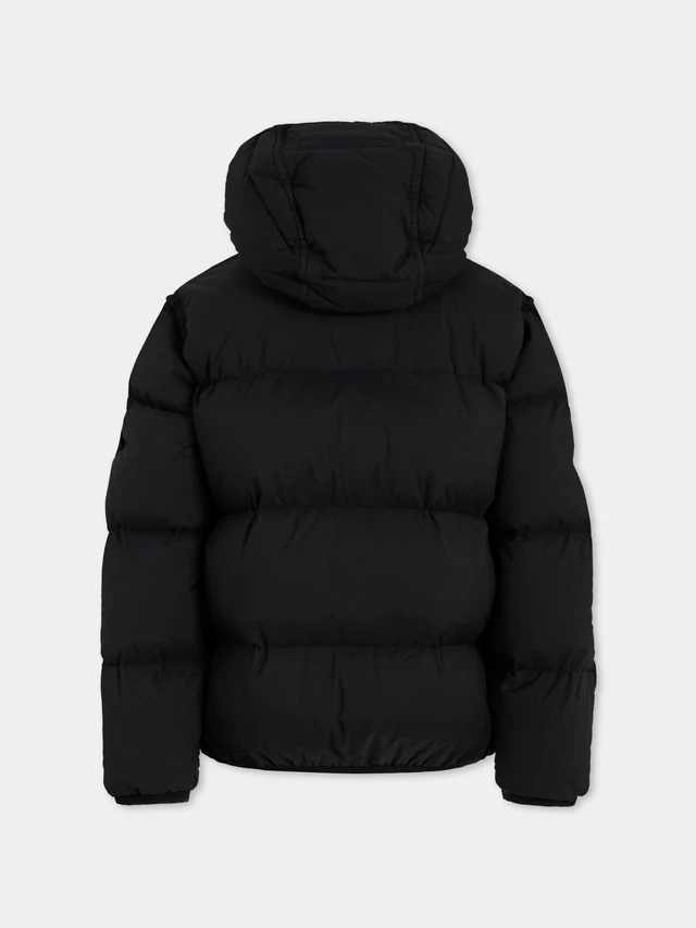 Piumino nero pesante, imbottito e trapuntato, a maniche lunghe, con cappuccio, chiusura frontale con zip, tasche laterali con zip, polsini e orlo elasticizzati. È decorato con iconico patch con bussola e logo applicato sulla manica.
