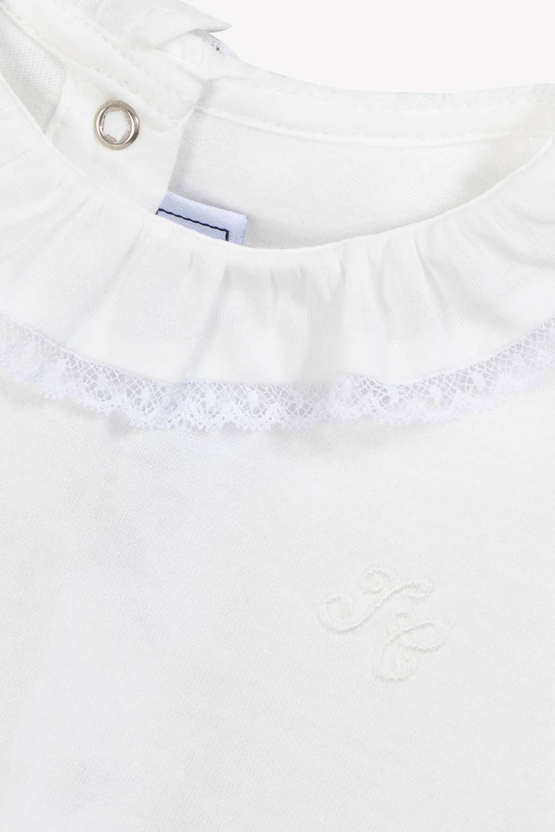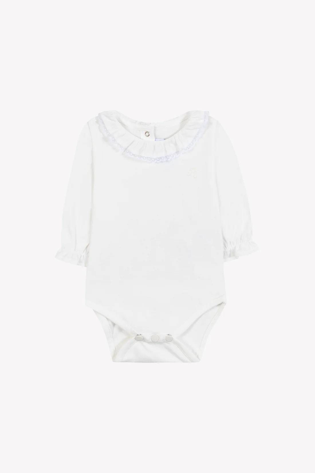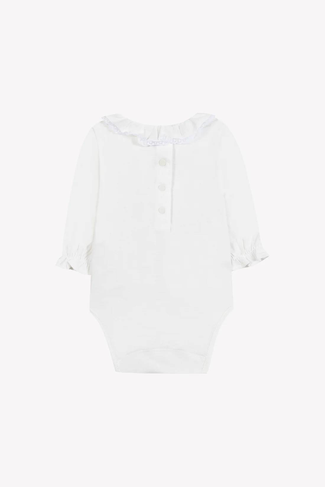 Body con ricamo sul colletto, maniche a smerlo con chiusura con bottoni sul retro. Logo ricmato sul davanti