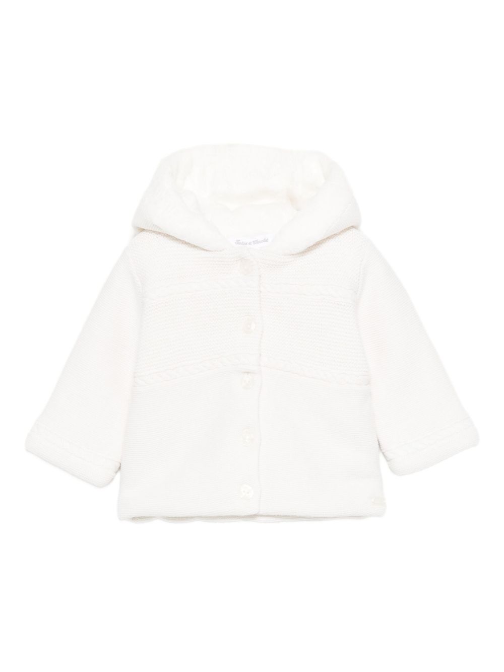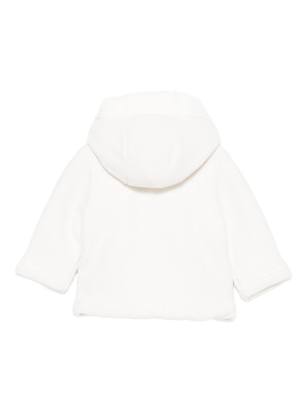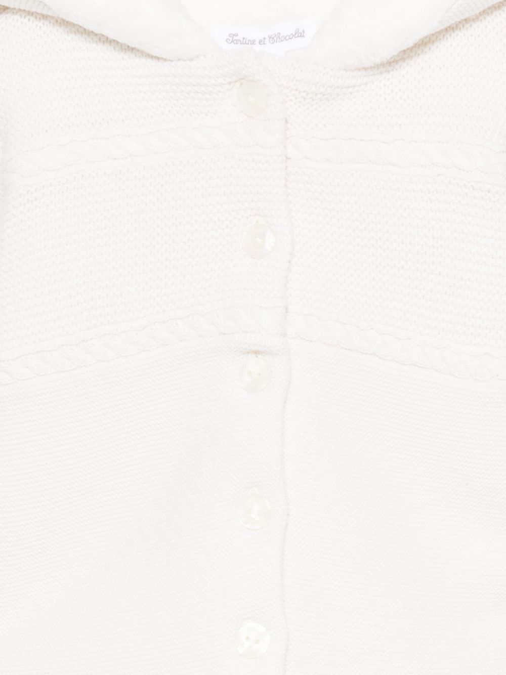 Cappotto con pelliccia biancomaglia intrecciatascollo con cappucciochiusura frontale con abbottonaturamaniche lunghe
