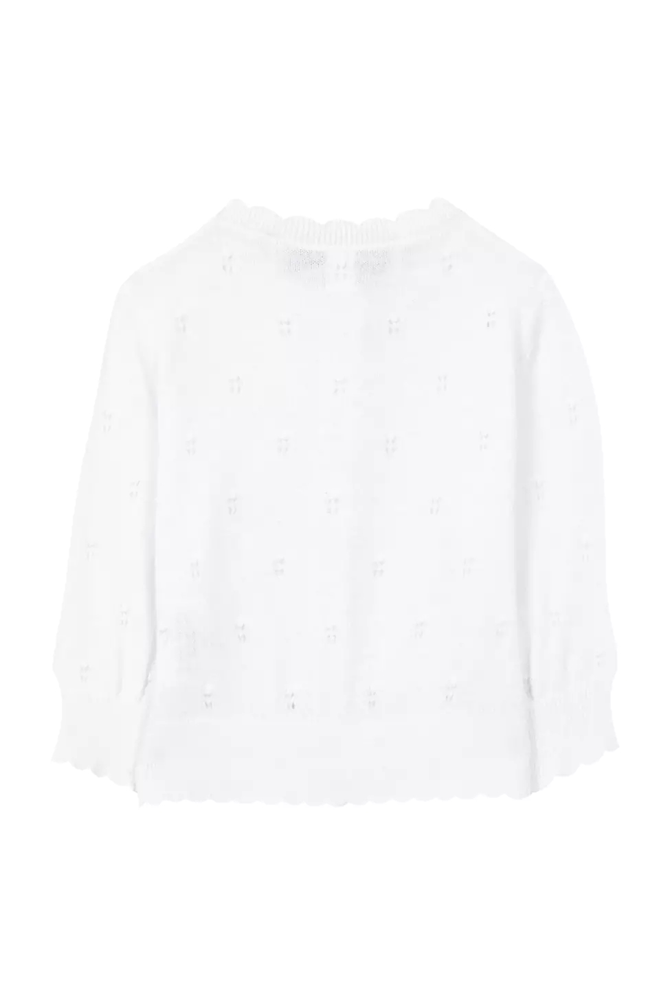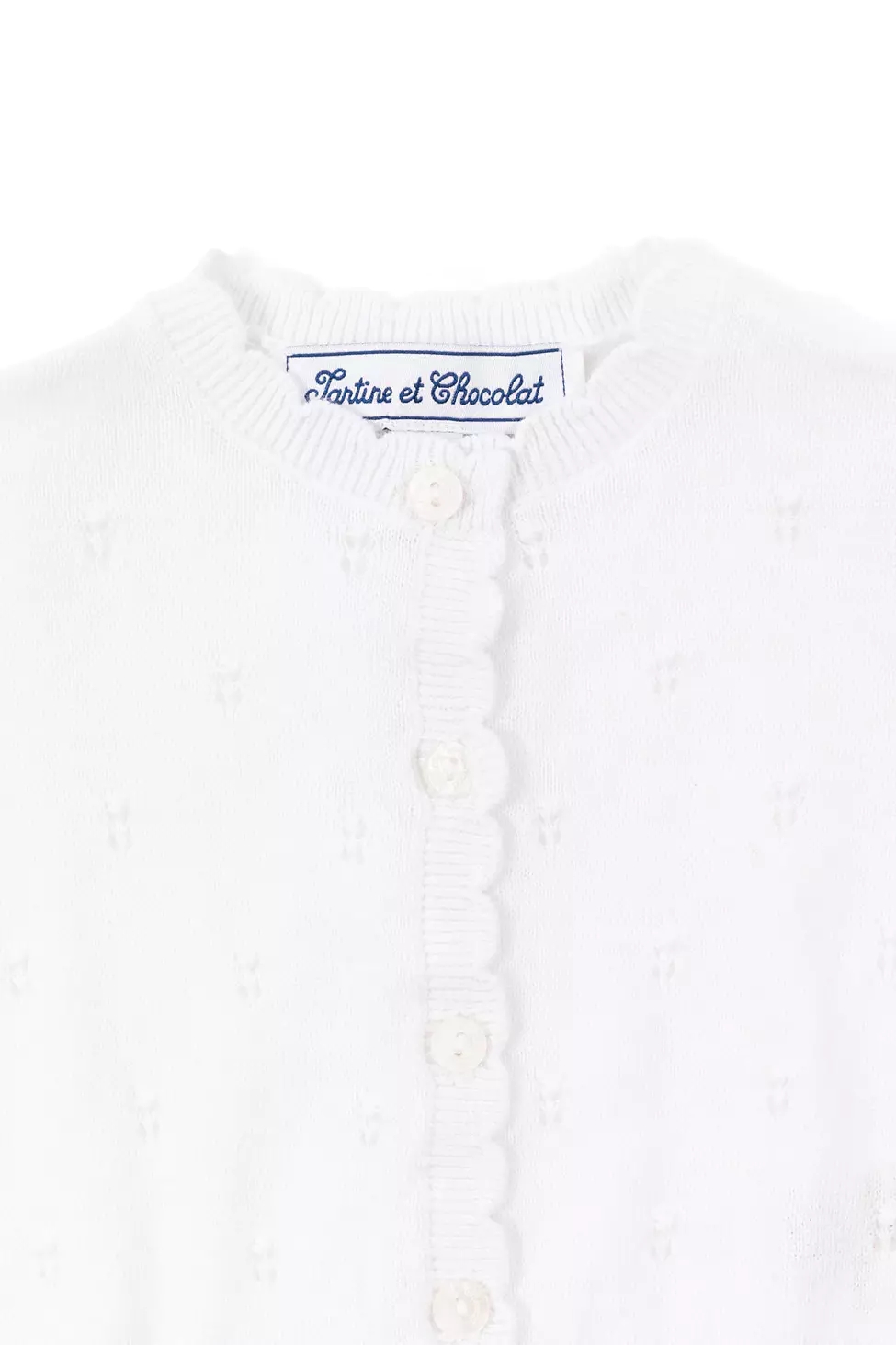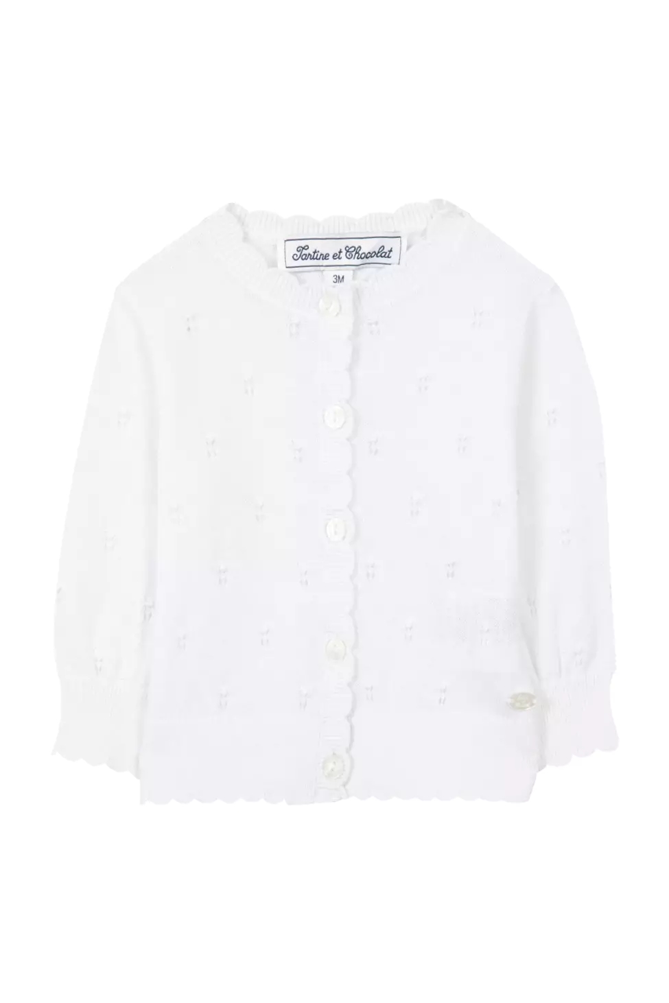 Cardigan in cotone con con chiusura verticane con cottoni, colore tenue e senza tempo combinato con il traforo floreale dona un tocco raffinato al cardigan.