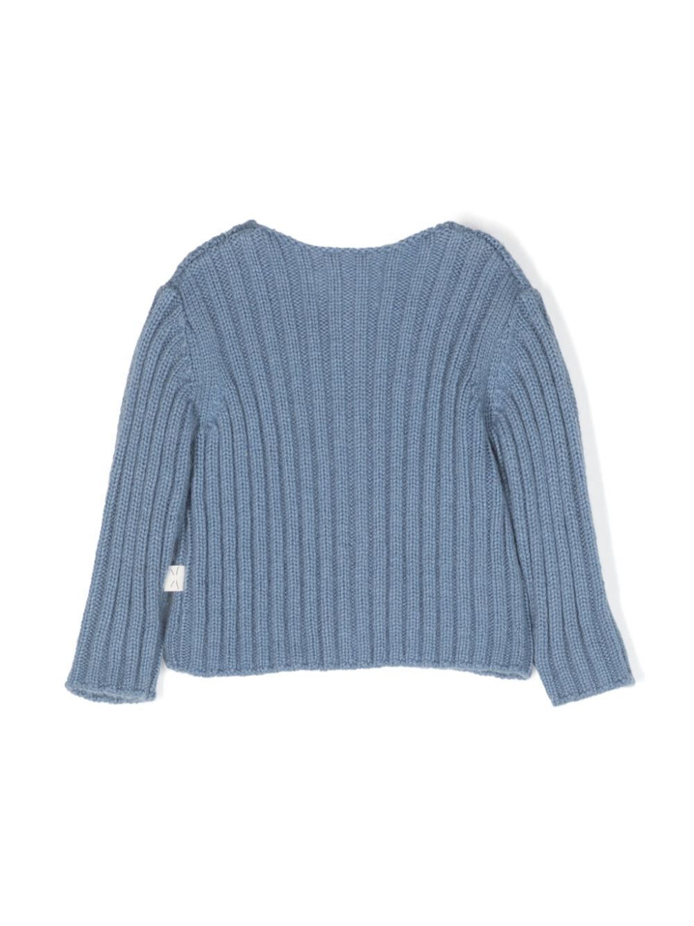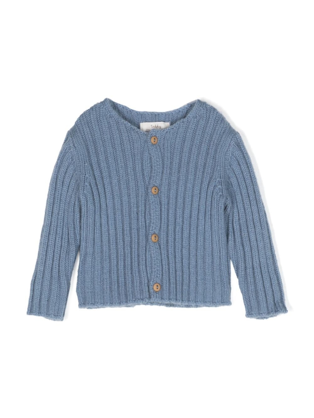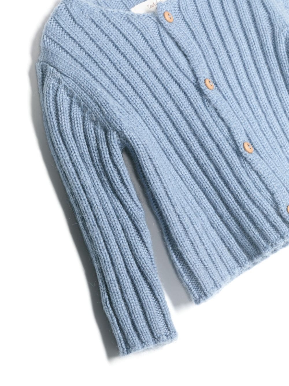 Blu alice, lavorazione a coste, scollo rotondo, chiusura frontale con bottoni, maniche lunghe e orlo dritto.