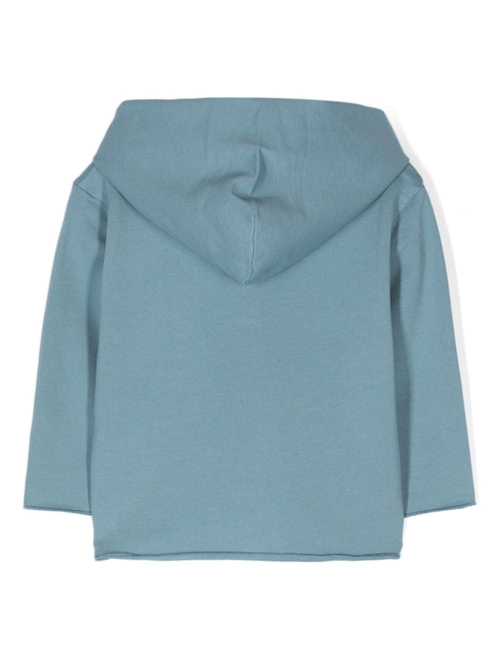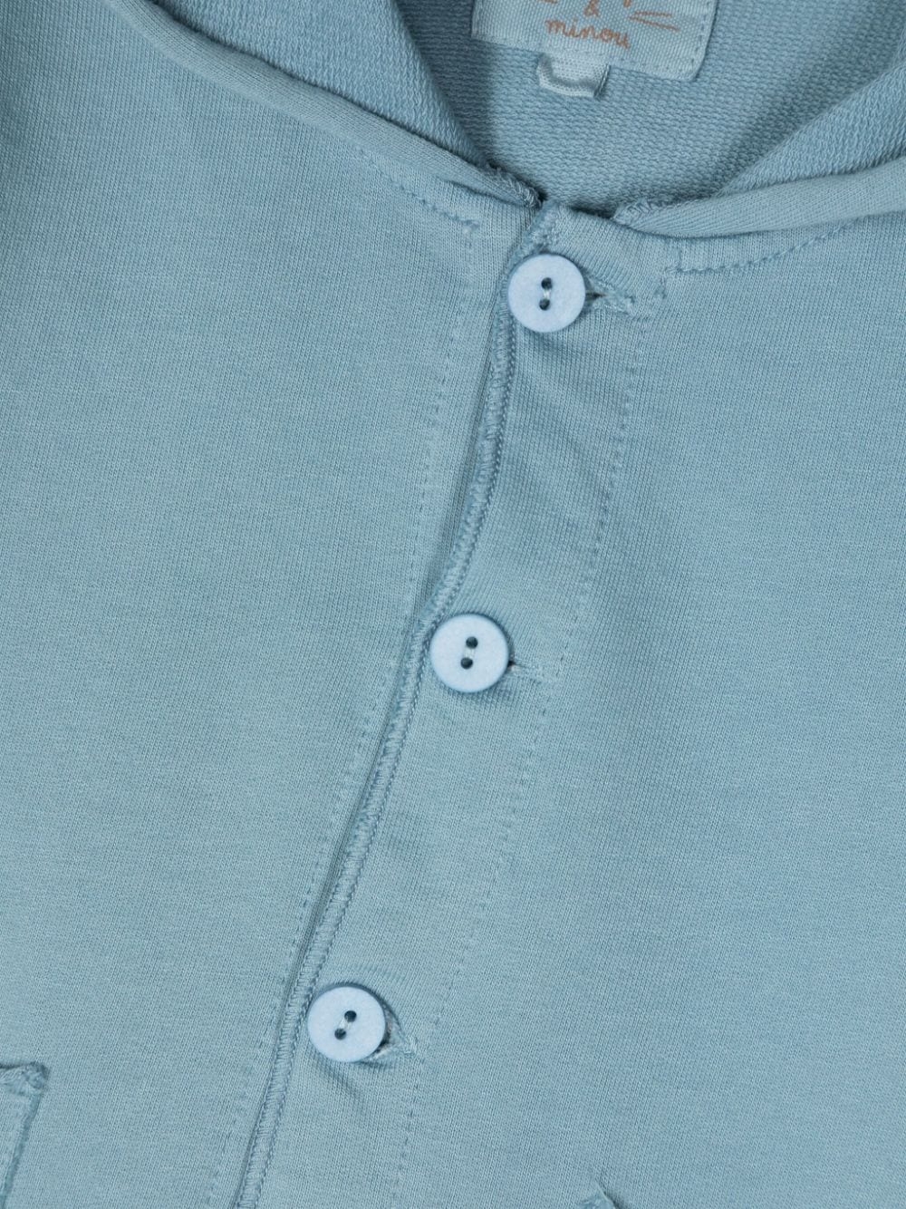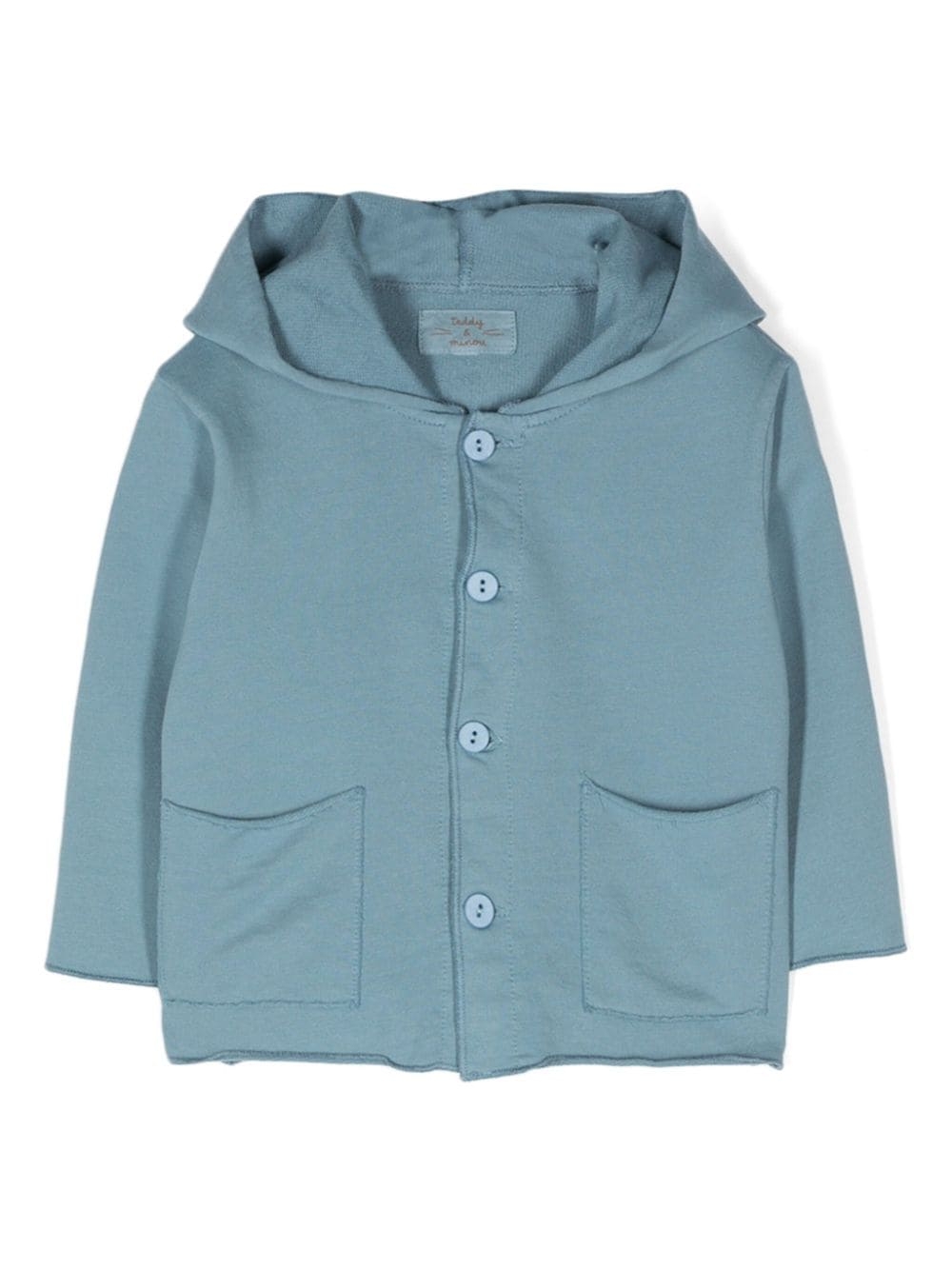 Cardigan lungo con cappuccio, due tasche laterali applicate, mini targhetta con logo e chiusura frontale con bottoni