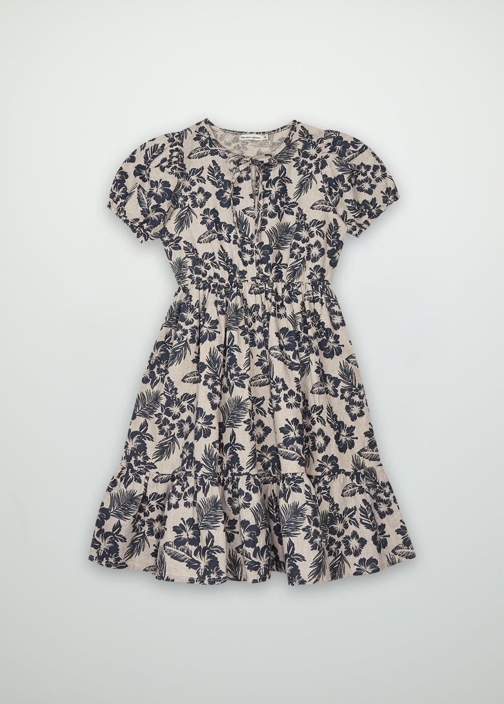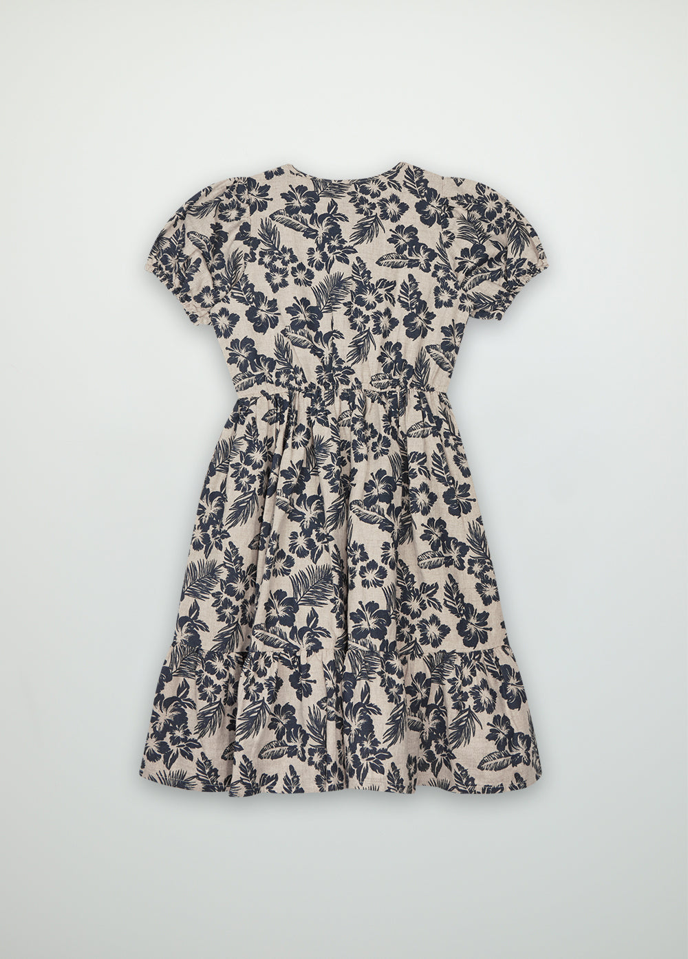 Abito in lino cotone con la nostra stampa hibiscus, girocollo aperto sul davanti e maniche corte a sbuffo, taglio in vita e gonna con volume e balza al fondo sotto il ginocchio
