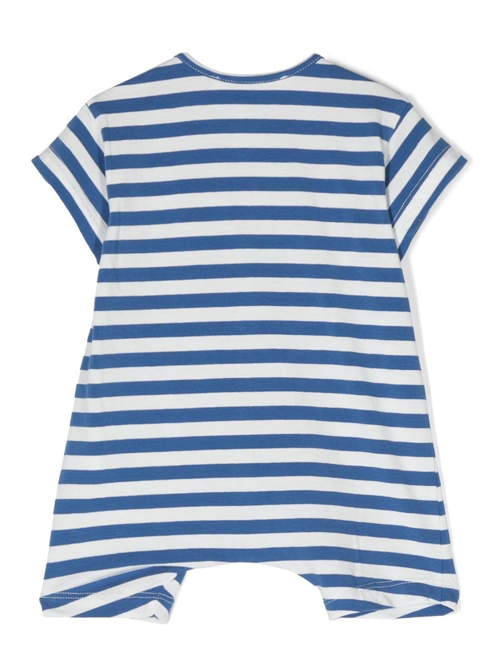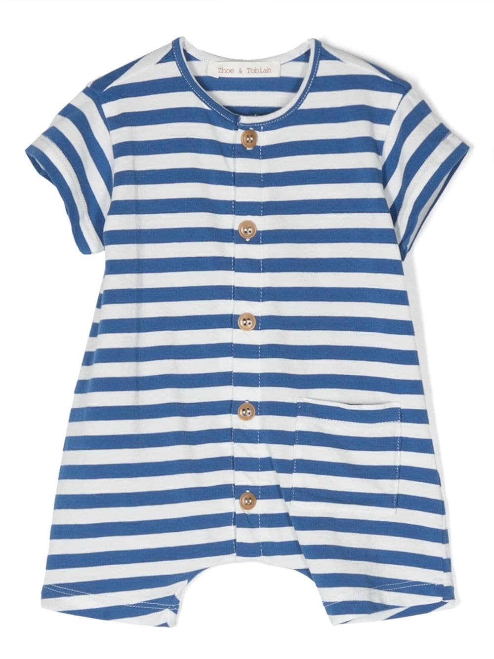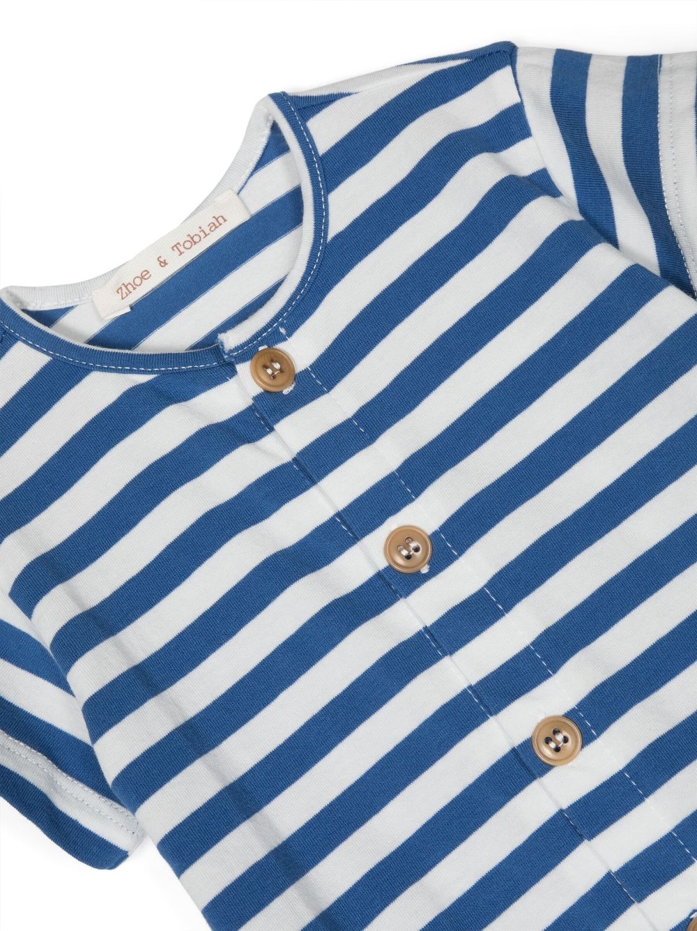 Bianco, indaco, stampa a righe, girocollo, chiusura frontale con bottoni e maniche corte.