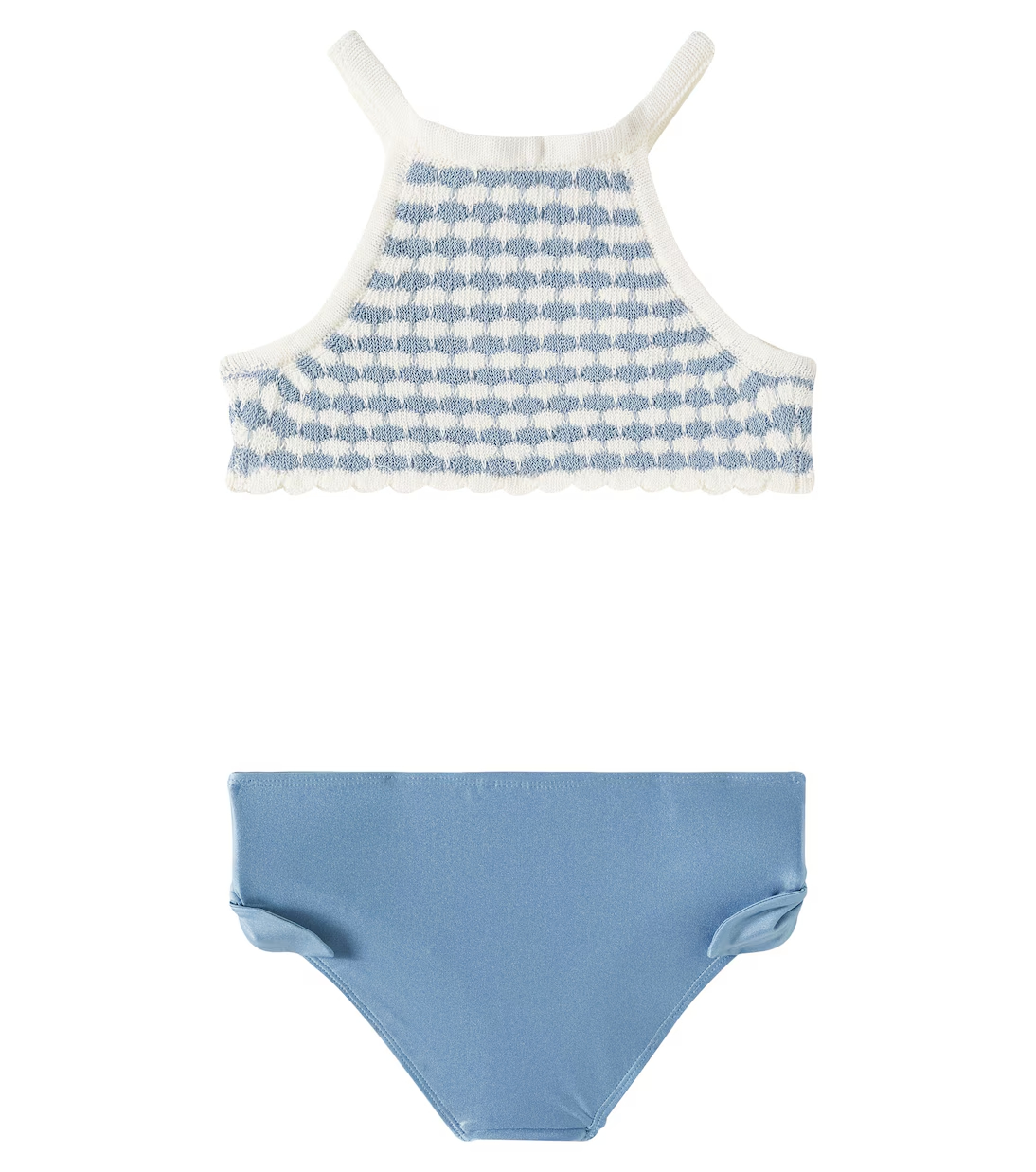 Costume 2 pezzi con crochet blu,con slip con fiocchi laterali.